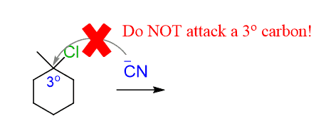 One key message you want to remember is to NEVER do an SN2 on a tertiary alkyl halide. The carbon is simply too sterically hindered (crowded) and cannot be attacked by the nucleophile.