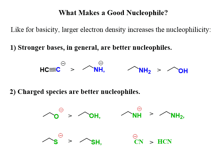 Another general trend to remember is that the conjugate base (deprotonated – negatively charged) of a compound is a better nucleophile than the neutral molecule.