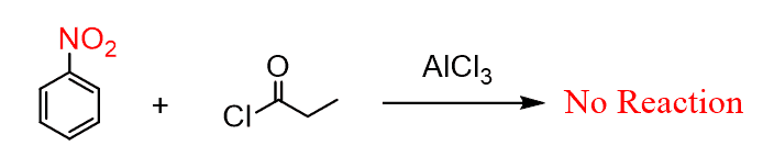 The deactivating effect prevents certain EAS reactions from occurring. For example, Friedel-Crafts alkylation and acylation reactions are among the slowest in electrophilic aromatic substitutions, and they simply do not work for nitrobenzene:
