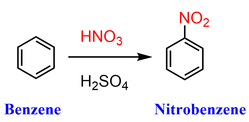 Nitration of benzene or its derivatives introduces a nitro (NO2) group into the aromatic system. The reaction is carried out with a mixture of nitric and sulfuric acids at temperatures above 50 oC.