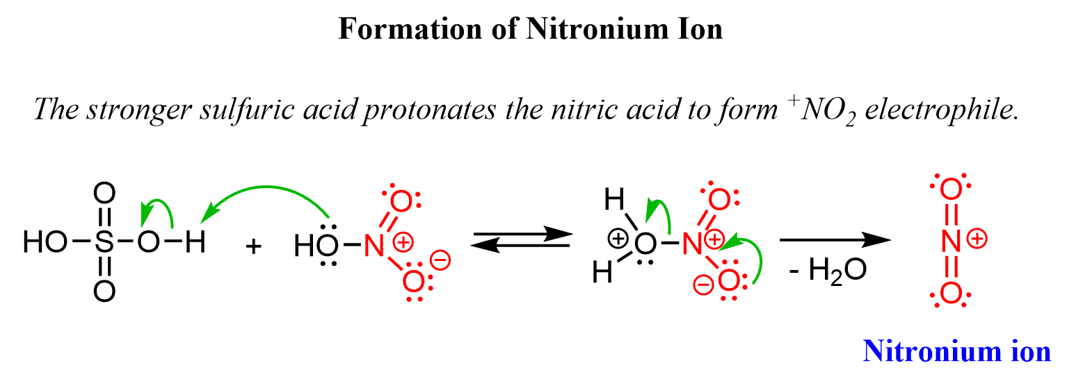 The role of sulfuric acid here is to create the nitronium ion (+NO2), which is the immediate electrophile reacting with the aromatic ring. The nitronium ion is formed as a result of the protonation of the nitric acid by sulfuric acid: