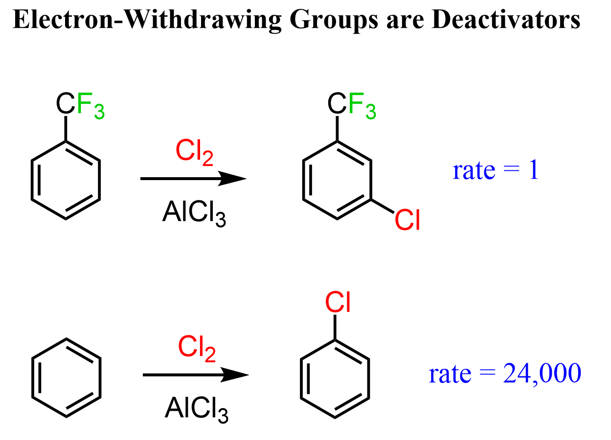 Now, if this group is attached to the benzene ring, it will withdraw significant electron density from the ring, making it less reactive in EAS reactions. As expected, the chlorination of benzene is about 24,000 times faster than that of trifluoromethylbenzene.