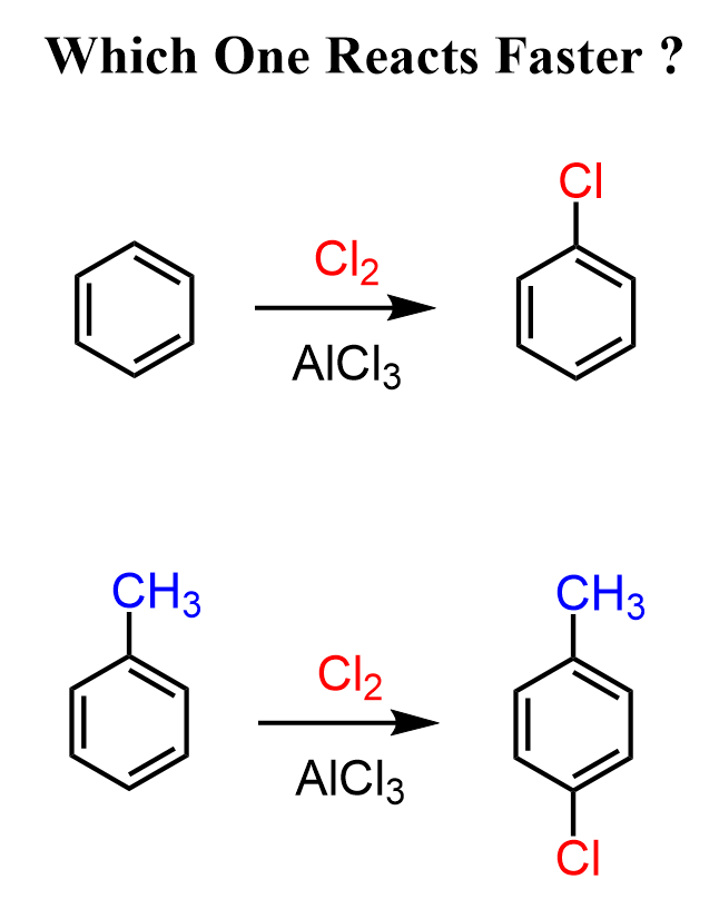Keeping in mind that alkyl halides are electron donors, what do you think – would benzene or toluene react faster in electrophilic aromatic substitution reactions?