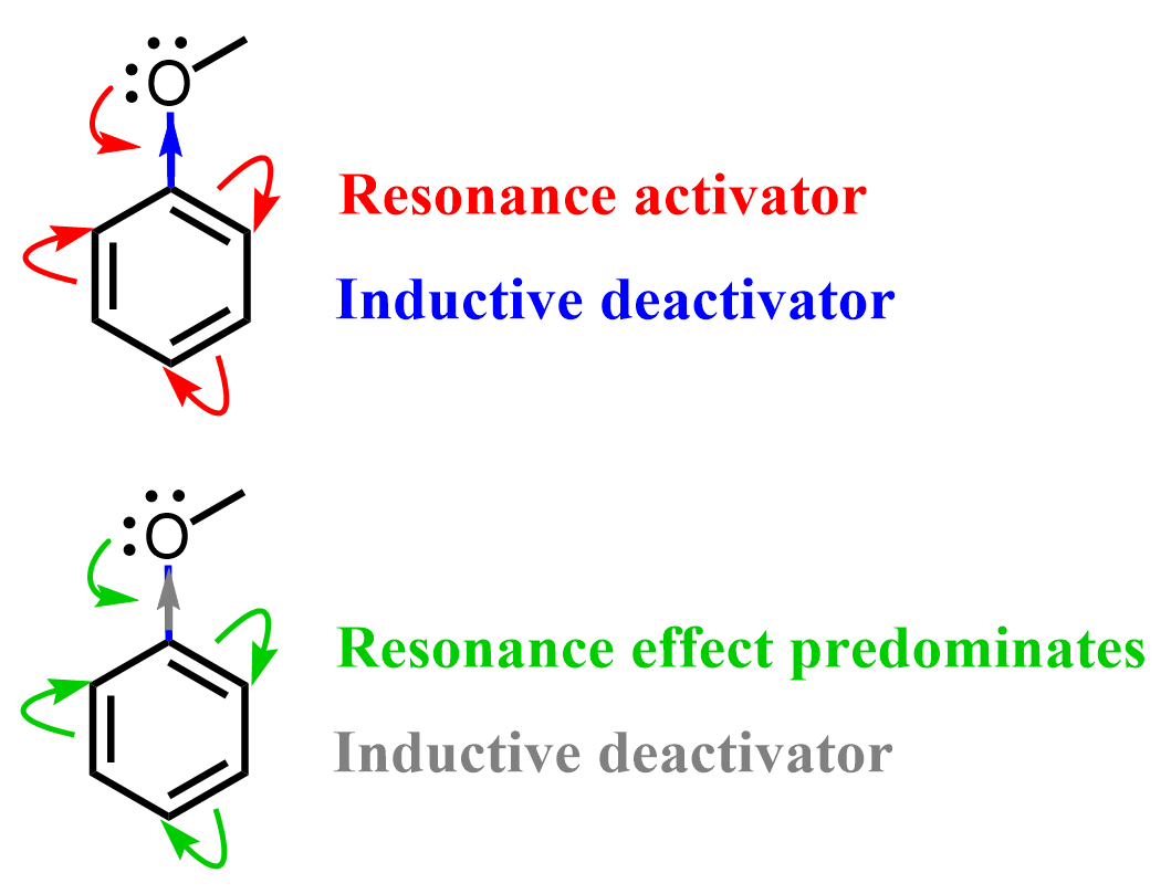 Therefore, the resonance donation is generally stronger and cancels out the reverse inductive effect. Once again, don’t forget that oxygen and nitrogen are more electronegative than carbon, and they deactivate the ring by an inductive effect, which is overwhelmed (canceled) by the stronger resonance-donating effect.