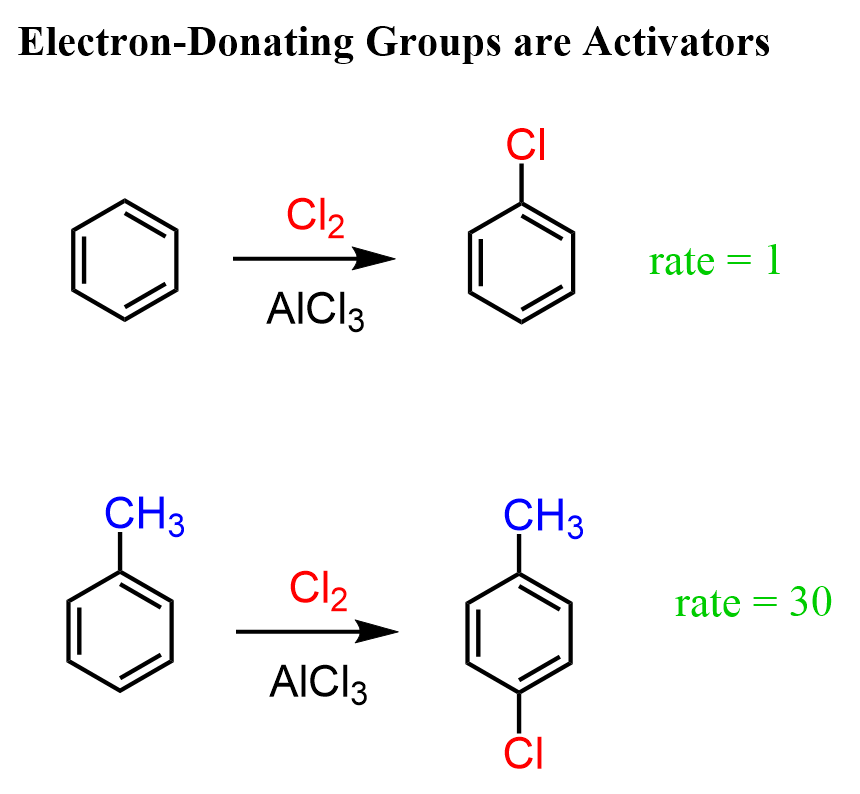 We can confirm this by experimental data of the chlorination of benzene and toluene under identical conditions. The chlorination of toluene proceeds about 30 times faster than benzene.