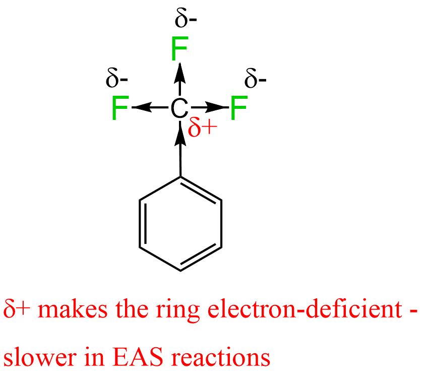 For example, if we replace the three hydrogen atoms of toluene with fluorines, that central carbon becomes very electron-deficient because of the greater electronegativity of fluorine atoms.