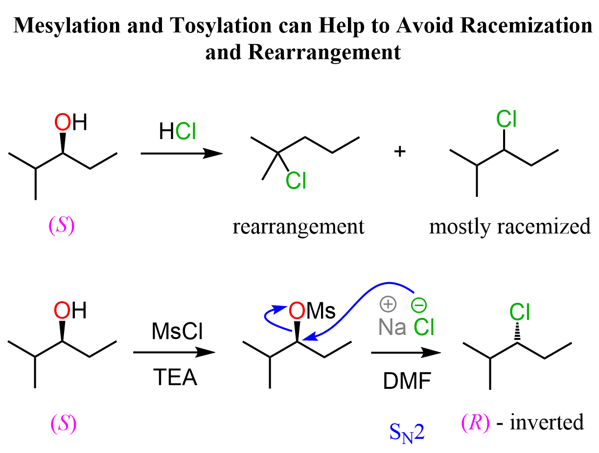 Here is also an example where mesylation and tosylation of alcohols can help react them by the SN2 mechanism and avoid undesired rearrangements that happen in acidic conditions: