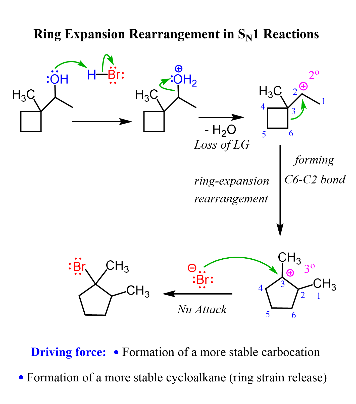 Ring-expansion rearrangements can also happen when alcohols with ring systems are reacted with HX acids. In this case, the carbocation intermediate is stabilized via an alkyl shift that forms a larger, thus a more stable ring. This typically happens with four or five-membered rings as they are rearranged to more stable 5- and 6-membered rings.