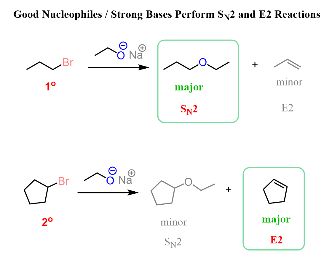 - To turn an alcohol into a good nucleophile and base (E2), we convert them to alkoxides, which greatly enhances their reactivity, favoring SN2 or E2 pathways depending on the alkyl halide.