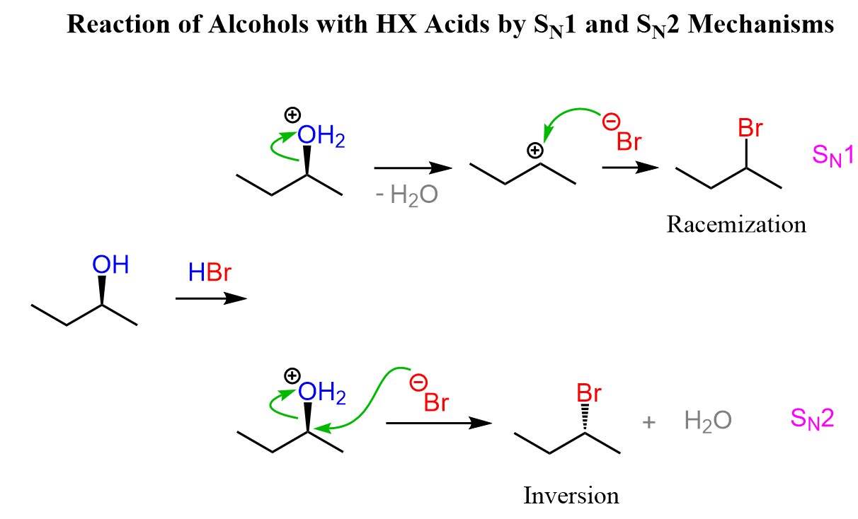 - When using HX acids to convert secondary or primary alcohols, rearrangements can occur due to carbocation intermediates. These include hydride or alkyl shifts and ring expansion rearrangements that lead to more stable carbocations. To avoid this and retain stereochemical control, the alcohols are converted to a mesylate or tosylate, SOCl2 or PBr3, and reacted via SN2 in a polar aprotic.
