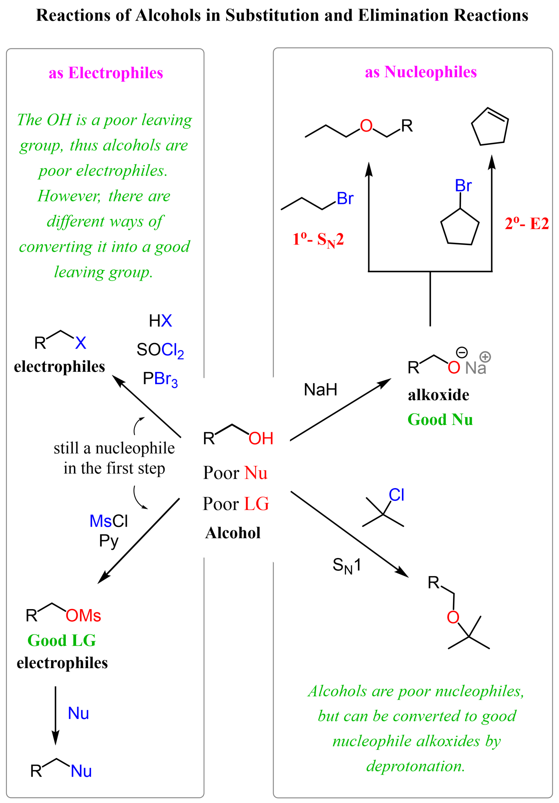 To use the alcohol as a substrate (like an alkyl halide), we either protonate the OH group by using HCl, HBr, or HI, and this reaction converts the alcohol into an alkyl halide. To have a larger pool of nucleophiles reacting with alcohols, we convert the OH group into a mesylate, tosylate, or a halogen to act as a good leaving group.