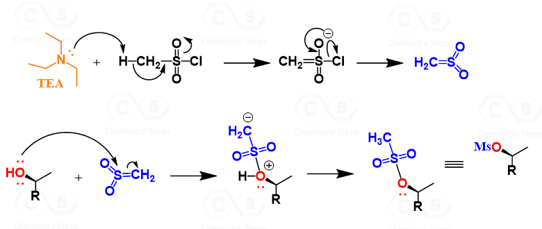 Mesylation goes with a slightly different mechanism. The first step here is the abstraction of the acidic ɑ proton from methanesulfonyl chloride. However, as for the tosylation, the chirality of the alcohol is retained.