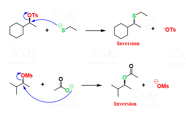 Alkyl sulfonates are a better alternative to HX acids and allow us to control the stereochemistry of SN2 substitution reactions on secondary alcohols. Some more examples are shown below and in the practice exercises.