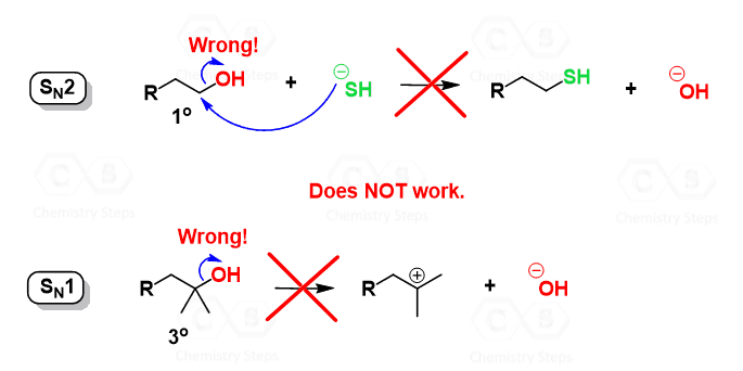The bottom line: OH cannot depart by itself and cannot be kicked out by a nucleophile.