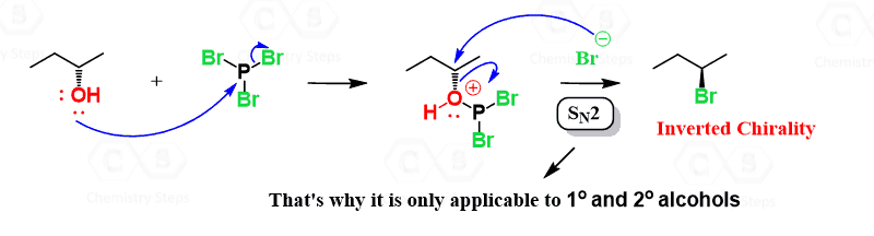 In a similar reaction, phosphorus tribromide, PBr3, is used to convert 1° and 2° alcohols to their corresponding alkyl bromides with inverted chirality:
