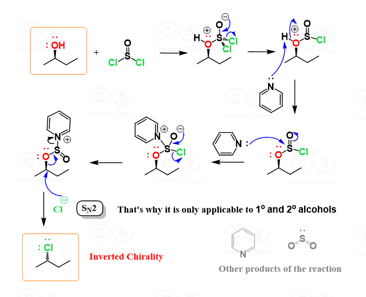 Thionyl chloride (SOCl2) is another great alternative to the HX acids that convert 1° and 2° alcohols to their corresponding alkyl chlorides with inverted chirality. Like for the sulfonyl chlorides, the first step is converting the OH into a good leaving group after which the chloride attacks via an SN2 reaction: