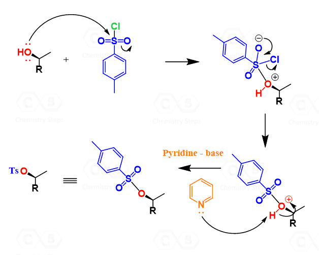Tosylates and Mesylates are prepared by treating alcohols with sulfonyl chlorides in the presence of a base (most often Pyridine or TEA). Notice that the carbon with the stereogenic center is not involved during this step, so the absolute configuration is retained in the resulting tosylate:
