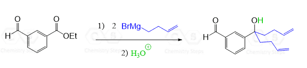 The product has three more carbons than the starting aldehyde. Therefore, you need to think of making new C-C bonds to extend the carbon chain. So far, you have probably covered only two reactions that allow making new carbon-carbon bonds: the