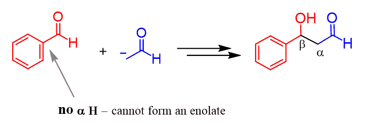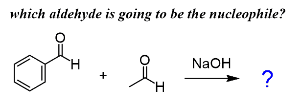 All the examples we discussed were reactions of the same carbonyl compound but what if we have a mixture of, for example, benzaldehyde and acetaldehyde treated with a base?