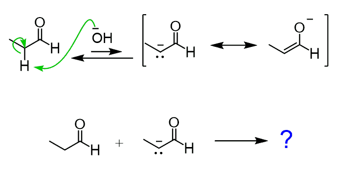 Now, would you expect to happen if we add a base to the solution of an aldehyde? Some of the aldehyde will be converted into an enolate – that’s the first thing, and we now have a mixture of an electrophilic aldehyde and a nucleophilic enolate: