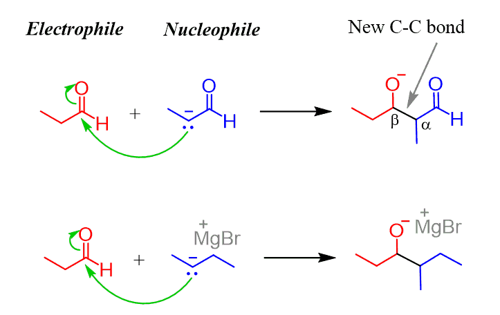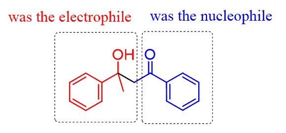 Let’s first visualize what comes from where in the aldol product. There are two parts – one from the nucleophilic carbonyl and the other, turned into an alcohol, from the electrophilic carbonyl: