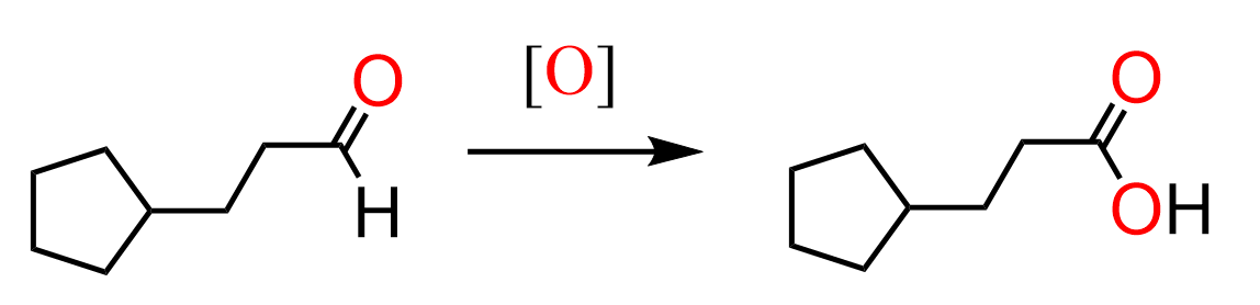 We can oxidize the aldehyde to carboxylic acid using any of the strong oxidizing agents such as H2CrO4, KMnO4, and NaClO mentioned in the article on oxidation of alcohols: