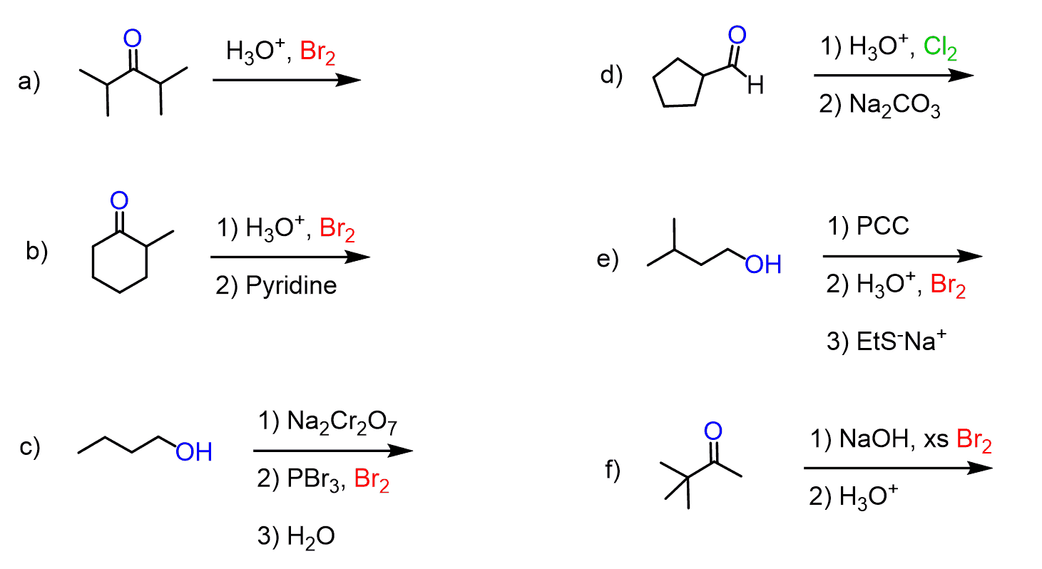 Propose reagents to achieve the following synthetic transformations. There is more then one step needed and there is at least one of doing through alpha halogenation of an enol or enolate.
