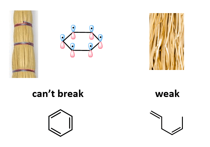 I like to think about it as a broom: you can easily break individual straws or a bunch of them when they are randomly stacked, but it wouldbe very difficult when they are all nicely aligned and tight together, just like the p orbitals of the aromatic ring: