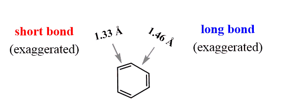 Let’s elaborate on this. It is now known that all the bonds in benzene are identical – 1.395 Å. However, if benzene existed in two resonance forms with alternating double bonds, we’d have two types of bonds: sp2–sp2 single bonds (1.46 Å) and double bonds (1.33 Å).