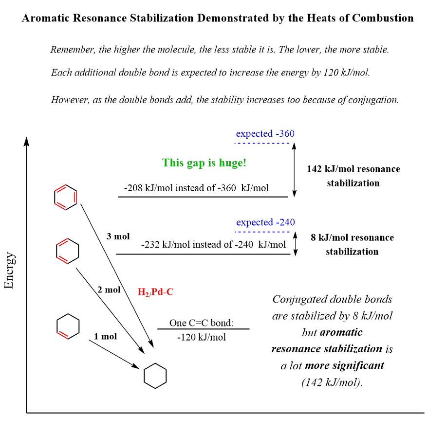 This huge energy difference is called the empirical resonance energy of benzene – the special stability of aromatic compounds originating from the resonance and conjugation.