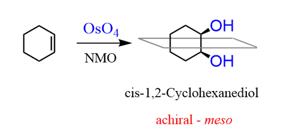 A meso compound is formed when the cyclohexene undergoes a syn addition. For example, syn hydroxylation produces the cis-dihydroxycycloheaxane, and the presence of a symmetry plane makes it a meso compound: