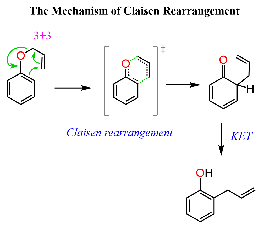 Let’s see how this transformation happens. The reaction proceeds through a concerted, cyclic transition state involving six electrons. Upon heating, the π electrons of the allyl group and the aromatic ring, together with the σ bond between oxygen and the allyl group, reorganize in a single step: the O-allyl σ bond breaks while a new C–C bond forms at the ortho position, and the π bonds shift accordingly to give an enol intermediate. The enol then rapidly tautomerizes to the more stable O-allylphenol.