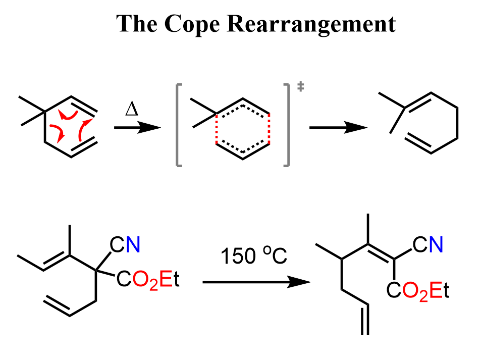 A similar rearrangement happens with 1,5-dienes, known as the Cope rearrangement. Like the Claisen rearrangement, it is a concerted pericyclic process that proceeds through a six-membered cyclic transition state, where bonds are broken and formed simultaneously in a single step with no intermediates. In both cases, a σ bond migrates across a π system in a stereospecific fashion, following orbital symmetry rules. The key similarity is that both are [3,3]-sigmatropic rearrangements involving 6 π-electrons in a cyclic transition state.
