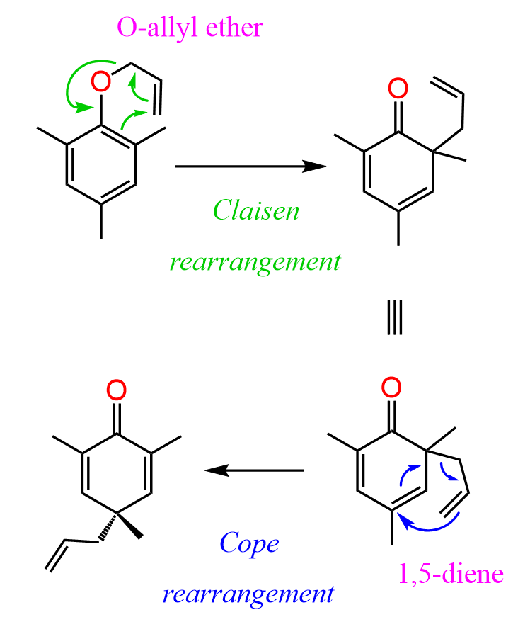 Sometimes a sequence of sigmatropic rearrangements can occur. For example, instead of phenyl allyl ether, if we take 2,4,6-trimethyl phenyl allyl ether, the allyl group ends up in the para position instead of the ortho position as in the earlier example.