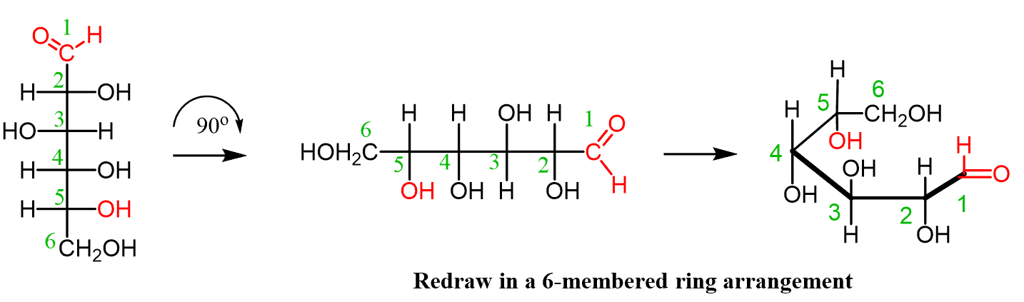 Let’s now see how this happens. First, we are going to draw the Haworth projection of the D glucose. To get this, simply flip the glucose by 90o and then rearrange the carbon chain to resemble a six-membered ring: