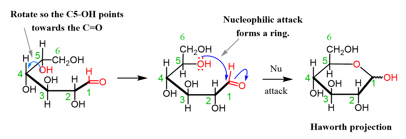 This happens as a result of a 180o rotation about the C1–C2 single bond, which places the C=O group pointing up or down. The attack of C5-OH group on the carbonyl carbon forms the ɑ-D-glucose and β-D-glucose anomers: