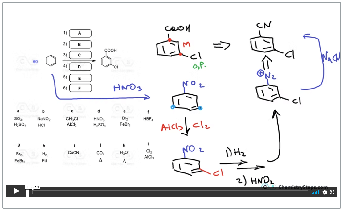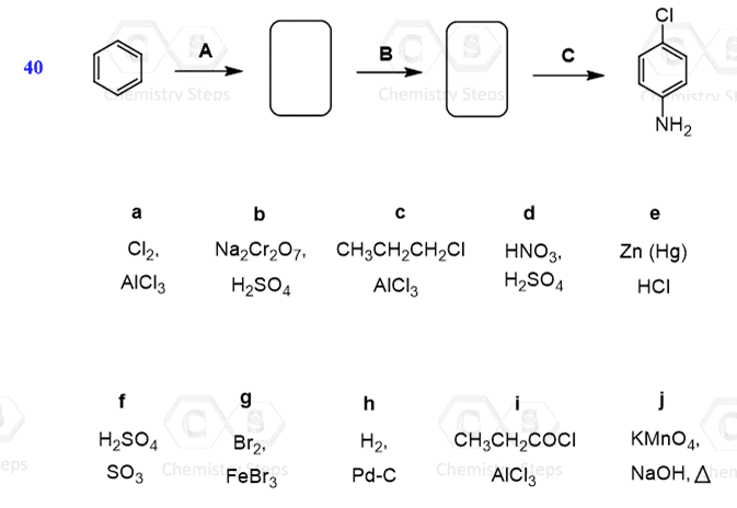 Questions 38 – 61: Multistep synthesis on aromatic compounds. Determining either the reagents for the target transformation or the product of each reaction given the set of reagents. This are a very useful exercise to master the concepts of aromatic substitution reactions. An example is shown below: