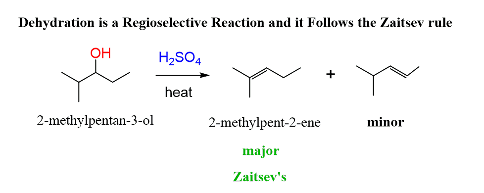 The dehydration is a regioselective reaction, and it follows Zaitsev’s rule. The more substituted alkene is the major product when a mixture of constitutional isomers is possible.