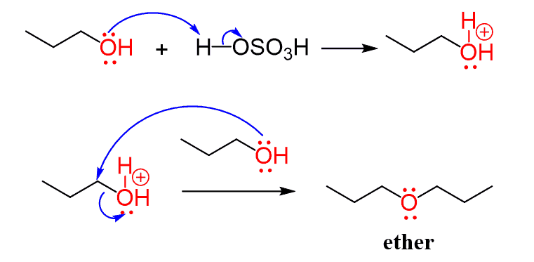 The protonated form of the hydroxyl group is an excellent leaving group, and when it is a primary alcohol, there is a possibility of an SN2 reaction to form an ether: