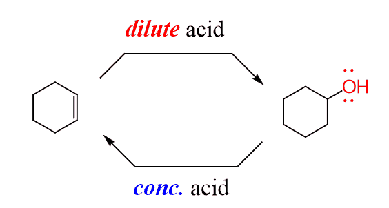 So, if we pay closer attention, both reactions are performed in acidic solutions, and the only difference is the concentration of the acid. Dehydration is achieved in concentrated acids, while acid-catalyzed hydration is performed in dilute acidic solutions: