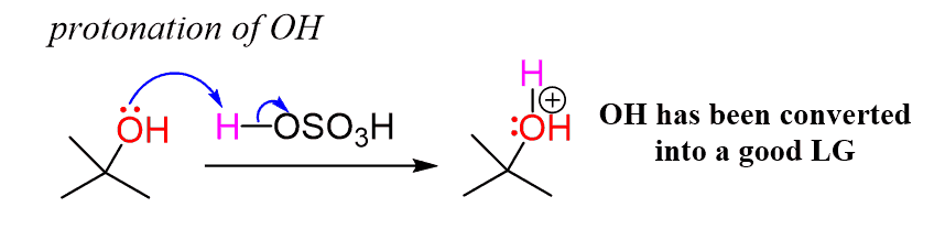 The first step of the reaction is the protonation of the hydroxyl group, which converts the OH into a good leaving group by weakening the C-O bond: