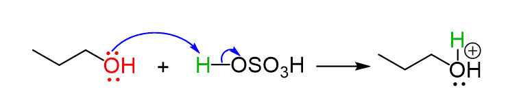 There are some similarities in these reactions, and just like in the E1 mechanism, the dehydration starts with the protonation of the primary alcohol, turning it into a good leaving group: