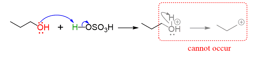 The reaction proceeds through an E2 mechanism because primary carbocations are highly unstable and cannot be formed as they do for secondary and tertiary alcohols: