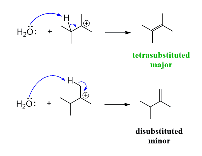 From here, there are two possible products of removing a β-hydrogen: a disubstituted alkene, which is the reverse reaction of the protonation, or a tetrasubstituted alkene, which is more stable and predominates as expected: