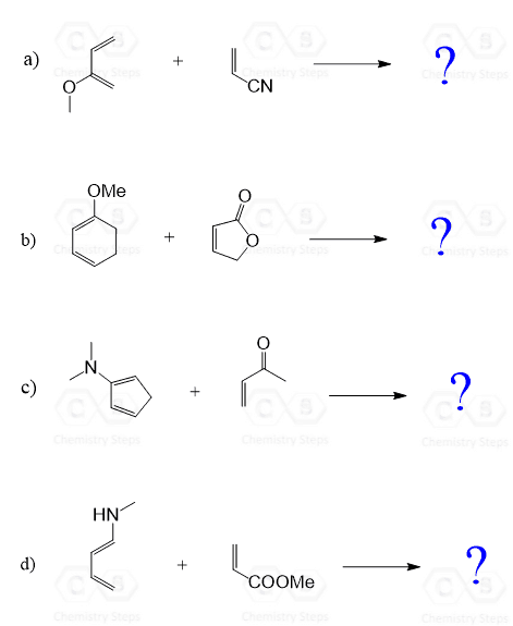 In this comprehensive set of practice problems, we will work through examples of Diels–Alder reactions that include both normal and retro Diels-Alder cases, as well as variations in regioselectivity and stereoselectivity. We will also look at endo and exo selectivity, and how substituents on the diene and dienophile influence the outcome of the reaction.