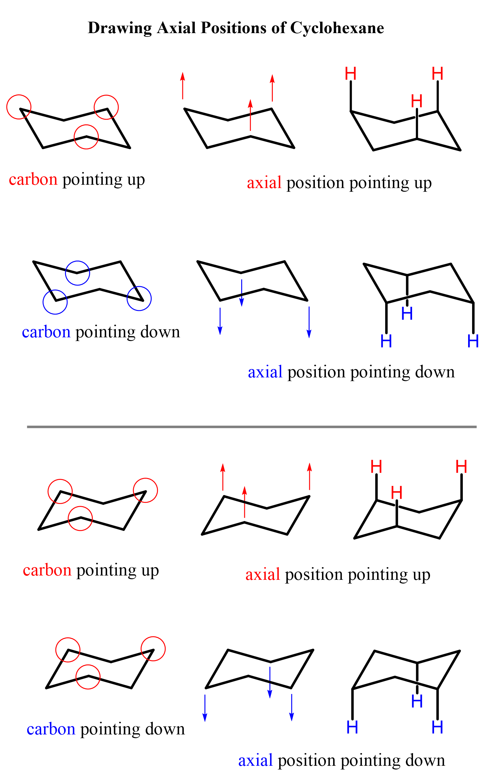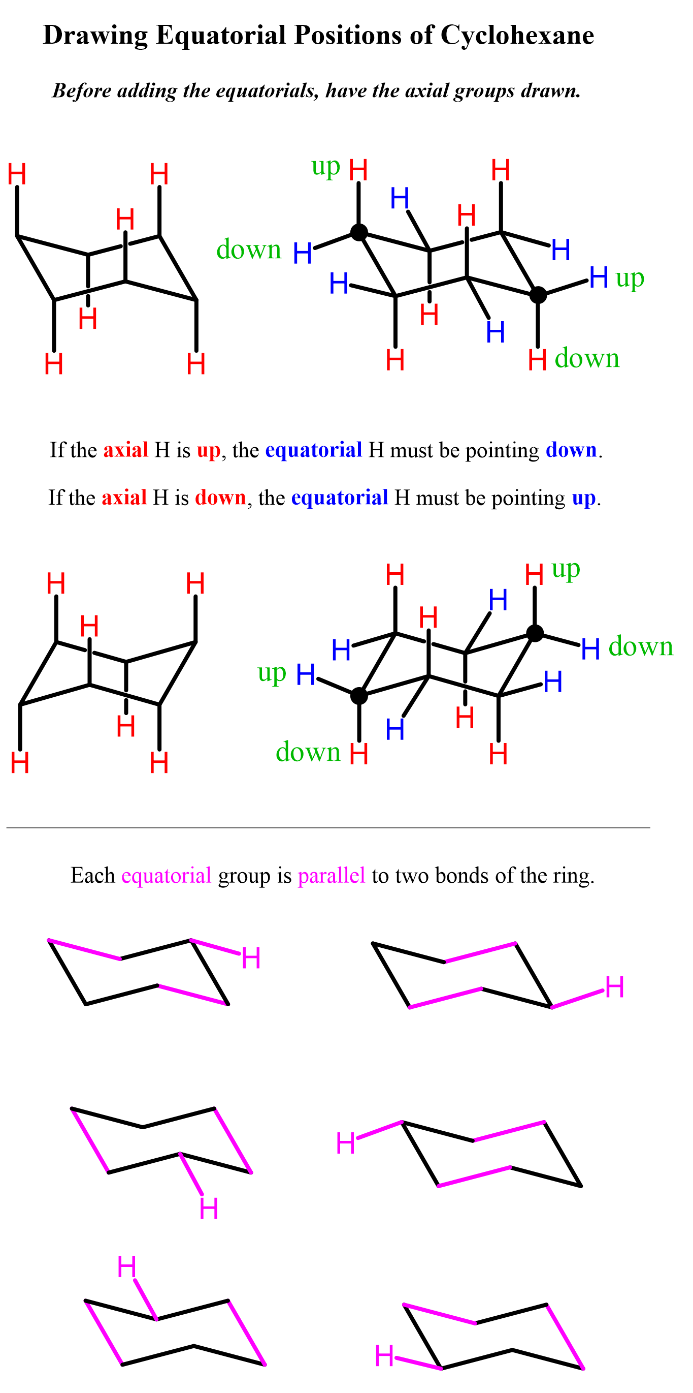 Once you have the axial groups drawn, add the equatorials. Remember, if the axial is pointing up, the equatorial group must be pointing down. If the axial is pointing down, the equatorial group must be pointing up. The equatorial positions are pointing to the sides, parallel to two C-C bonds in the chair: