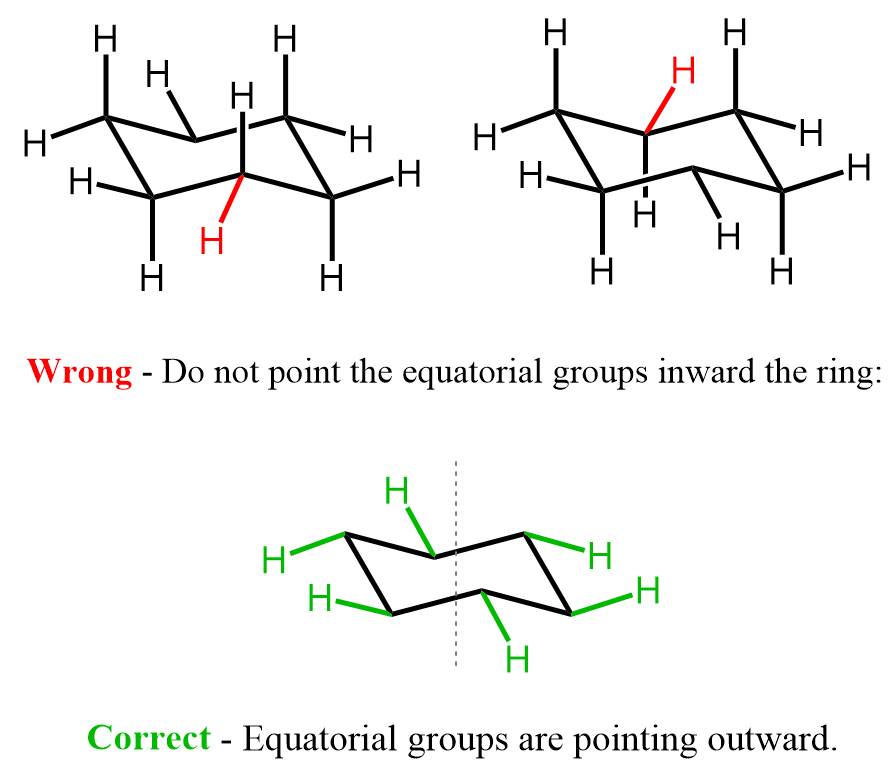 What we have shown above is the carbon skeleton of the chair conformations, and as drawn, the carbon atoms require two hydrogens to satisfy the octet. These hydrogens, or any other atoms, must also be drawn at correct angles and directions, classified as axial and equatorial positions: