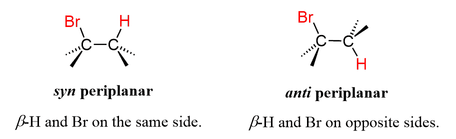Notice that the anti-periplanar (180o) alignment of the Br and the β hydrogen is only possible when the Br occupies an axial position. None of the β hydrogens appear to be at 180o to the Br when it is equatorial.