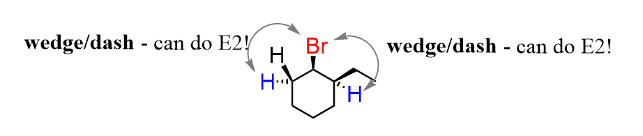 To summarize, remember, in the E2 reaction of cyclohexanes, only the hydrogen opposite to the leaving group (wedge/dash or dash/wedge) can participate in the elimination.