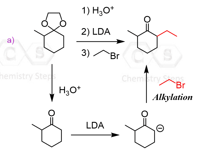 The starting material is a cyclic acetal which serves as protecting groups for aldehydes and ketones. Therefore, it needs to be removed first before the alkylation of the alpha carbon can occur. Notice that the alkylation occurs at the less substituted carbon since LDA is used as a strong, sterically hindered base which favors the kinetic product in direct alkylation of enolates.